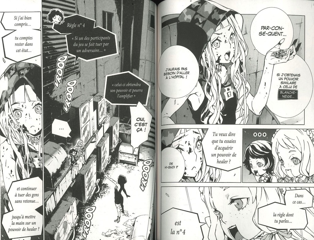 Au moins maintenant, on commence à comprendre les forces en présence : essentiellement composées de 2 équipes : « Blanche-Neige est secondée par Pinocchio et Alice, alors que Cendrillon compte dans ses rangs Chaperon rouge et Princesse Kaguya. Cependant, on s’attend encore à ce que d’autres personnages « féériques » sortent du bois…. A suivre donc là aussi.