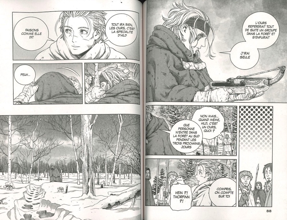 Le point marquant de ce #26ème tome est l’évolution du personnage d’Hild ; la terrible chasseuse d’Ours, qui a conclu un pacte de mise à mort avec Thorfinn si celui-ci massacre à nouveau ses semblables, a changé elle aussi. Elle est bien plus apaisée, s’occupe même de l’éducation des enfants ! La terrible chasseuse à l’arbalète prend conscience de cet état lors d’une chasse et prend alors la décision de se décocher définitivement de sa colère et de sa vengeance. L’auteur nous offre ainsi une fin de tome très émouvante.