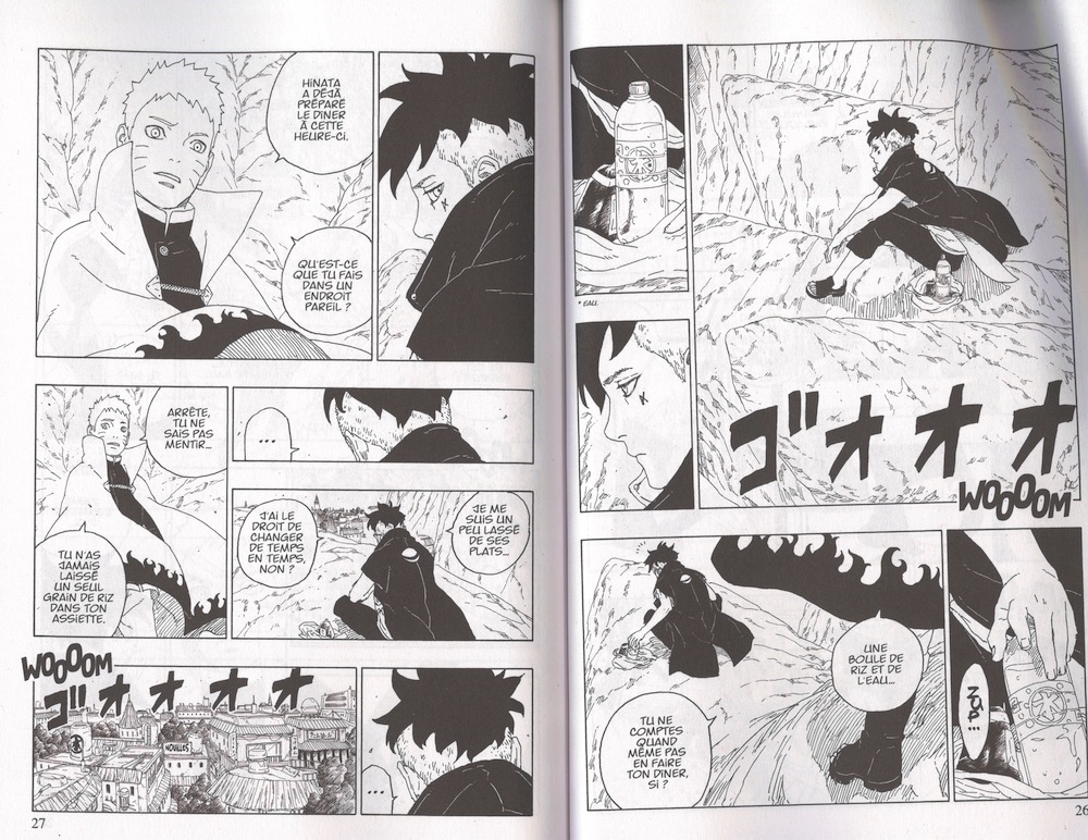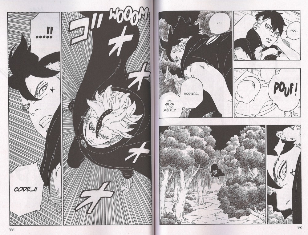 Ca parle, ça berdelle, ça cause… Le tournant narratif que l’auteur (Masashi Kishimoto) a donné à son manga lors de son retour aux commandes nous laisse pour l’heure assez dubitatif…. Depuis le volume précédent, on n’a jamais aussi bien suivi les pensées des personnages principaux (et même secondaires) : des chapitres entiers où il ne se passe … rien. Et quand enfin, l’action se profile, quand enfin on s’attend à un Kawaki vs Code du feu de Dieu, ils échangent quelques coups, puis ils … doivent discuter de leur avenir !?!