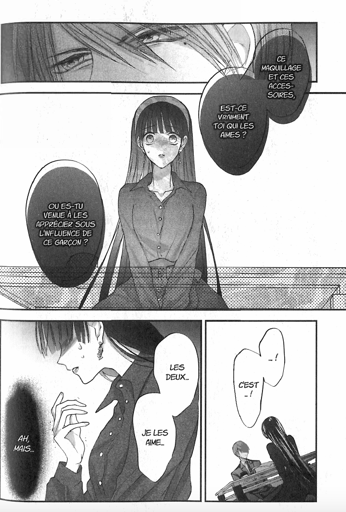 Ce 3e tome va me contrarier une nouvelle fois, car (attention spoiler !), Miku, pourtant déterminée à faire comprendre à son fiancé qu’elle a le droit de se maquiller comme elle l’entend et surtout de s’assumer telle qu’elle le désire, va encore se laisser prendre au jeu manipulateur de son compagnon. En fin stratège, il a songé à tout !