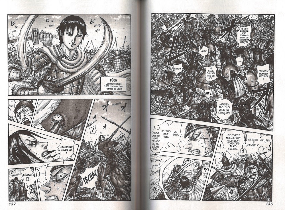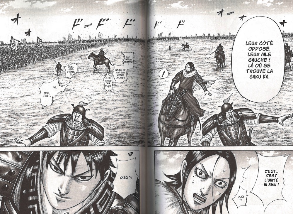 D’autre part, il se sert toujours avec efficacité du massacre perpétré par le grand Général Kanki comme justificatif pour nous présenter des soldats ennemis galvanisés par le combat et n’hésitant pas à échafauder des missions suicides pour défendre leur sol. Ce Kanki est de plus en plus au cœur des différentes intrigues, reléguant même les personnes principaux de Qin – dont Shin lui-même !- au second plan.