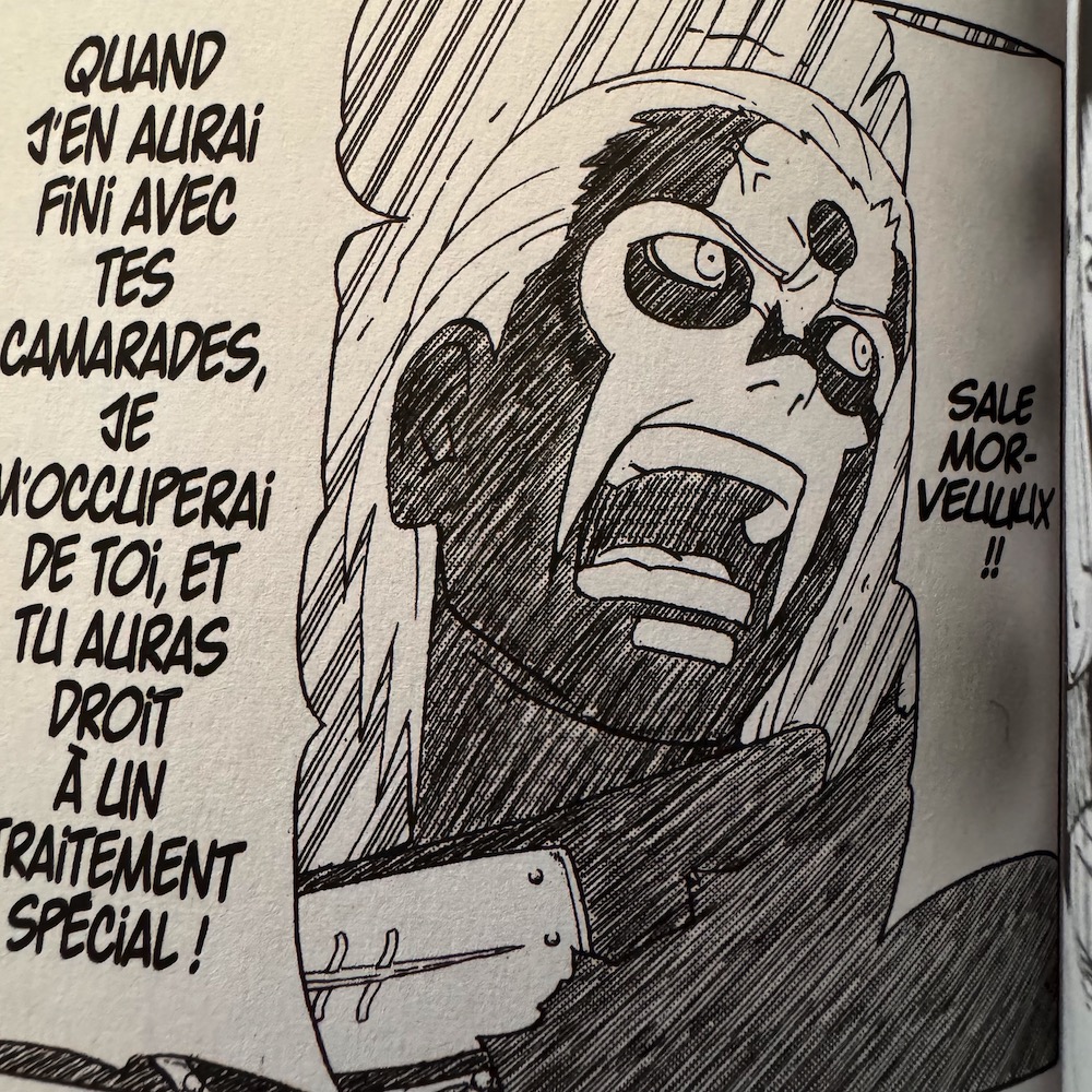 En parlant de personnages secondaires, le nouveau duo d’antagonistes d’Akatsuki ne réussissent guère mieux à nous tenir en haleine (en début de tome tout du moins) : l’auteur leur confère une grande puissance et voudrait nous entrainer dans sa lecture en saupoudrant de mysticisme vampirique les pouvoirs de l’un d’eux tandis que l’autre a comme caractéristique première d’aimer l’argent…. A tout le moins, reconnaissons que Masashi Kishimoto ne fait pas trainer les choses dans la quête des Bijû et les pages de confrontation qu’il nous délivrera avec l’équipe de Konoha lancée sur leurs traces seront magnifiques !