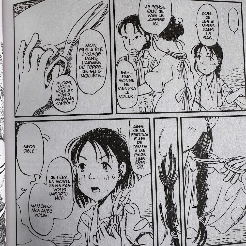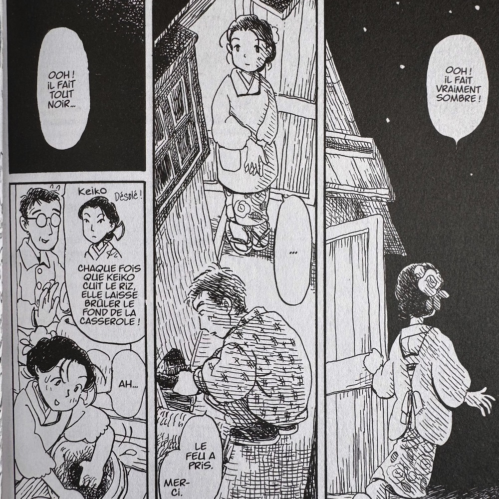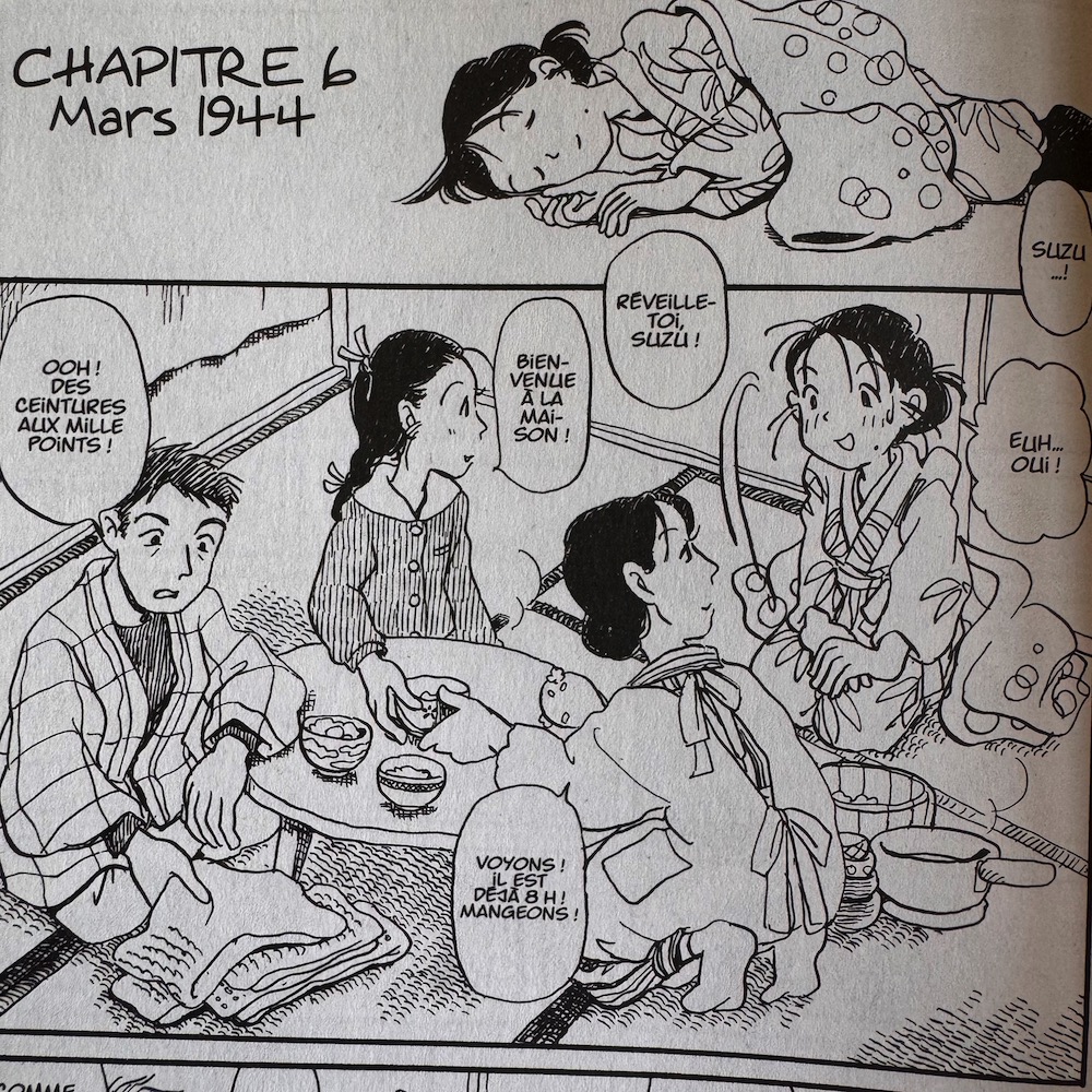 Et voici sans nul doute l’énorme force de ce diptyque : la mangaka nous fait découvrir le regard japonais, celui du camp des perdants. Ce regard surprenant, inédit pour nous est abordé par le biais des tranches de vie d’une famille simple habitant la banlieue de Hiroshima durant les années 40-45. On découvrira au fil des pages les conséquences collatérales que subiront au jour le jour la population jusqu’à son paroxysme apocalyptique.