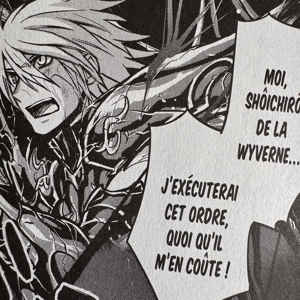 Voilà ce qu’on attendait ! voilà de l’épique, du grandiose ! Quel combat emprunt d’adrénaline que nous délivre ici les auteurs ! La noirceur de l’âme corrompue d’un Gold Saint face à un Wyvern aussi charismatique que l’original créé par Masami Kurumada !