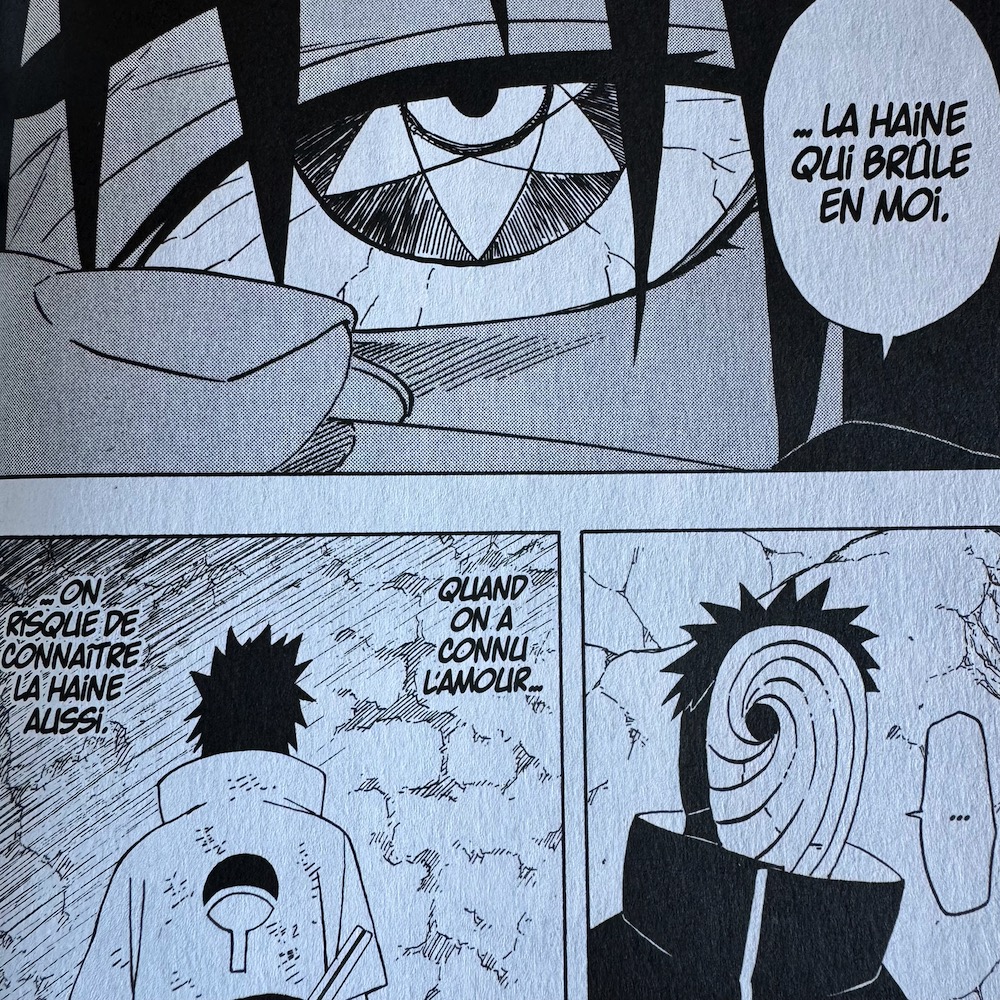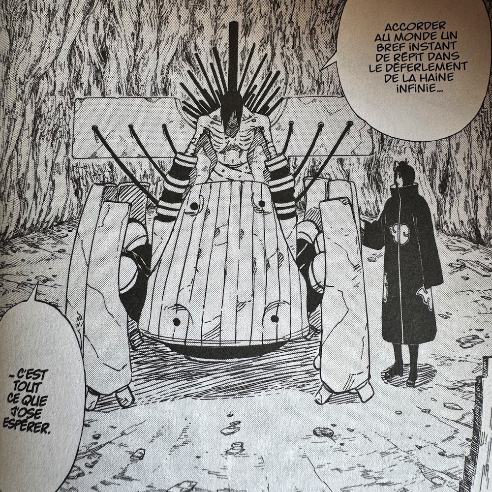 « Tous deux, nous sommes des êtres ayant connu la souffrance. Tu luttes pour ta justice et moi pour la mienne. En réalité, nous sommes des êtres ordinaires focalisé sur la vengeance, mais que l’on camoufle sous le terme de « justice ». Malheureusement, ce travestissement de la réalité en appel toujours à plus de vengeance et c’est ainsi que se créer la chaîne de la haine. Avec un peu de recul, on prend conscience que les hommes sont des êtres qui ne m’arriveront jamais à la compréhension mutuelle car les soubassements du monde des Shinobis sont faits de haine. Et toi, puisque tu veux la paix, que préconise-tu face à cette haine ? »