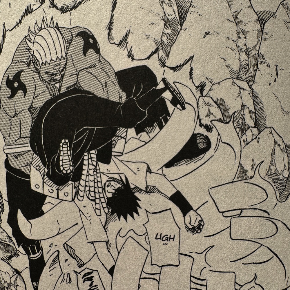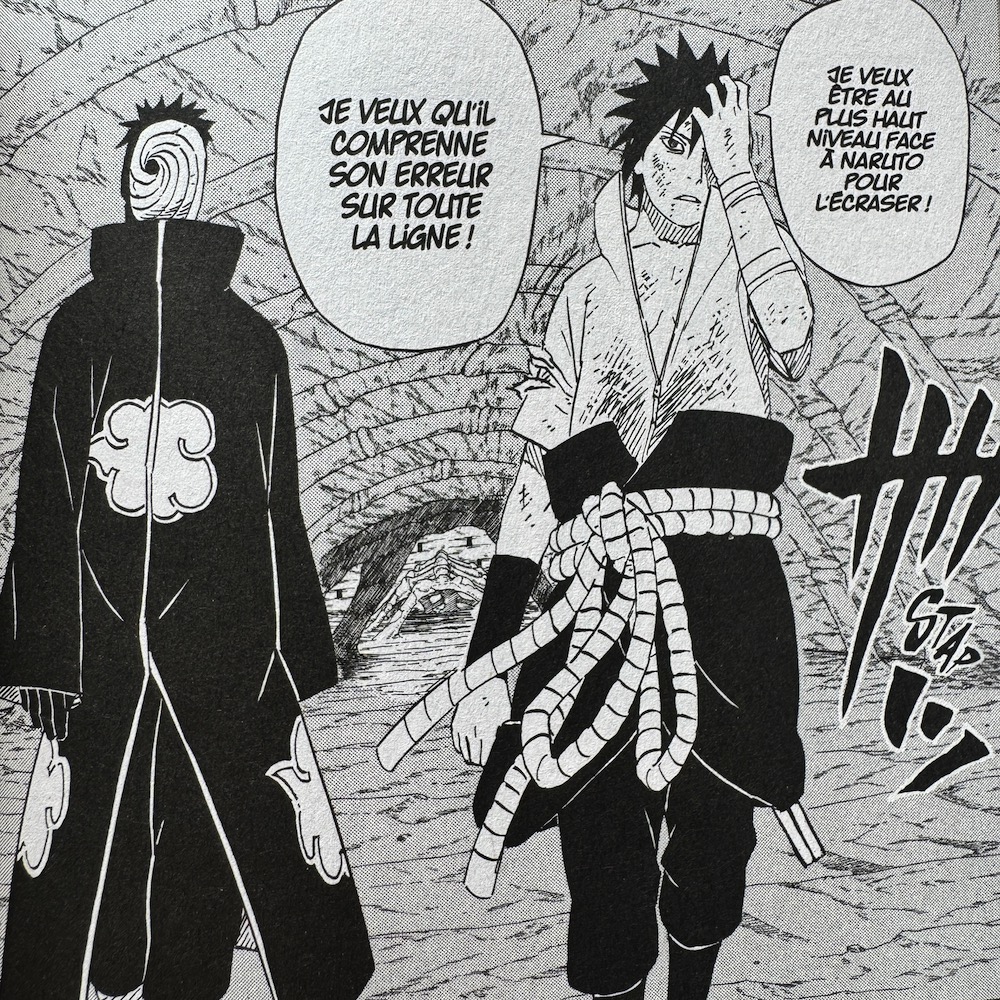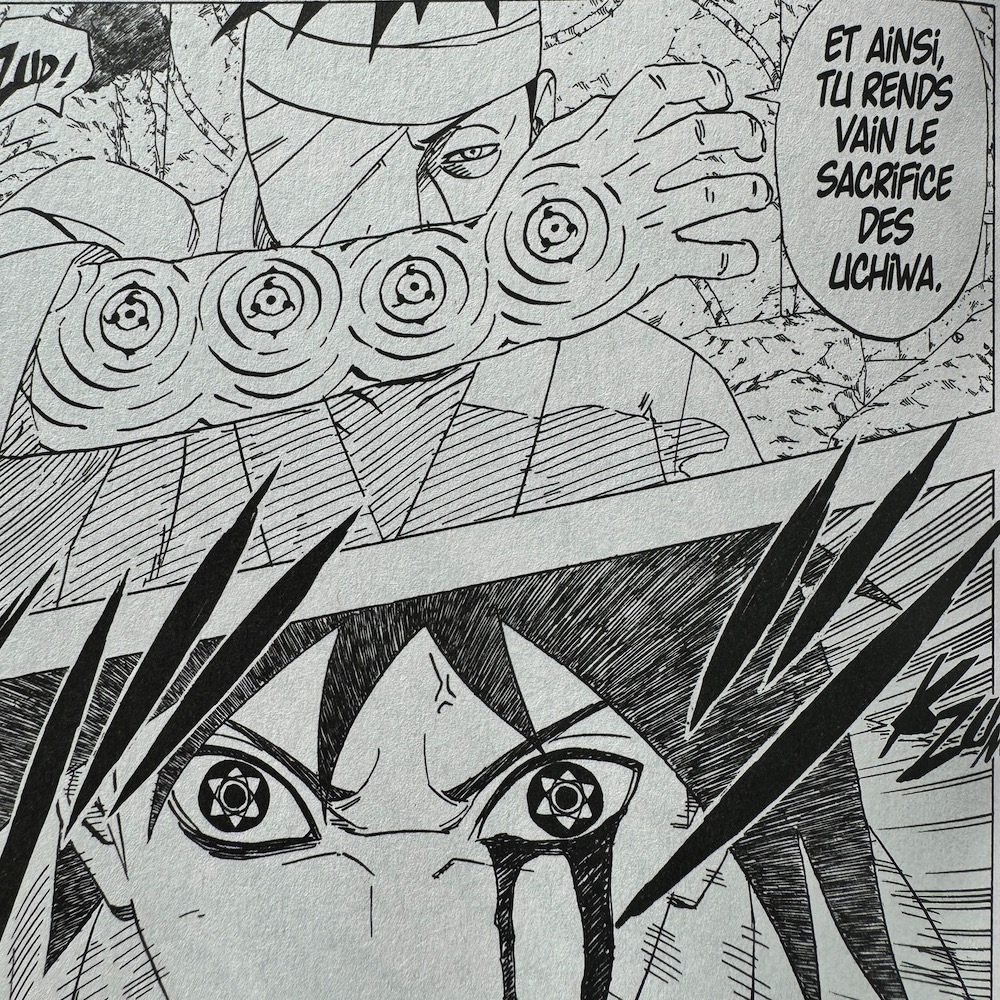 Le 26ème opus débute sur un nouveau duel : Denzô, l’Hokage-rénégat et Sasuke que Madara a stratégiquement enlevé pour le mettre face à ce bourreau. Sans doute l’une des confrontations que j’aime le moins dans toute l’ère Shippuden. Le personnage de Denzô n’inspire que dégoût et la mise en scène de la confrontation est brouillonne, tant graphiquement que dans les justificatifs alambiqués des sharingans volés de Denzô… En quelques chapitres, on est passé d’un climax de début d’Arc exceptionnel à ce momentum raté. Tout au plus aura-t-il permis à notre mangaka de sortir définitivement de l’histoire ce personnage mal écrit depuis le début.