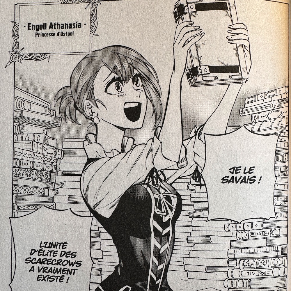 Ce qui frappe en premier, lorsque l’on découvre pour la première fois ce manga est son Design. On est bien loin des mangas japonais habituels : le charadesign des personnages, mais aussi des lieux baigne dans une atmosphère toute autre. Ainsi, la tunique de la princesse Engell ou même rien que le livre dans lequel elle découvre l’existence de l’unité d’élite des Scarecrows attirent le regard du lecteur par ses différences avec le code graphique commun à ce type de lecture.